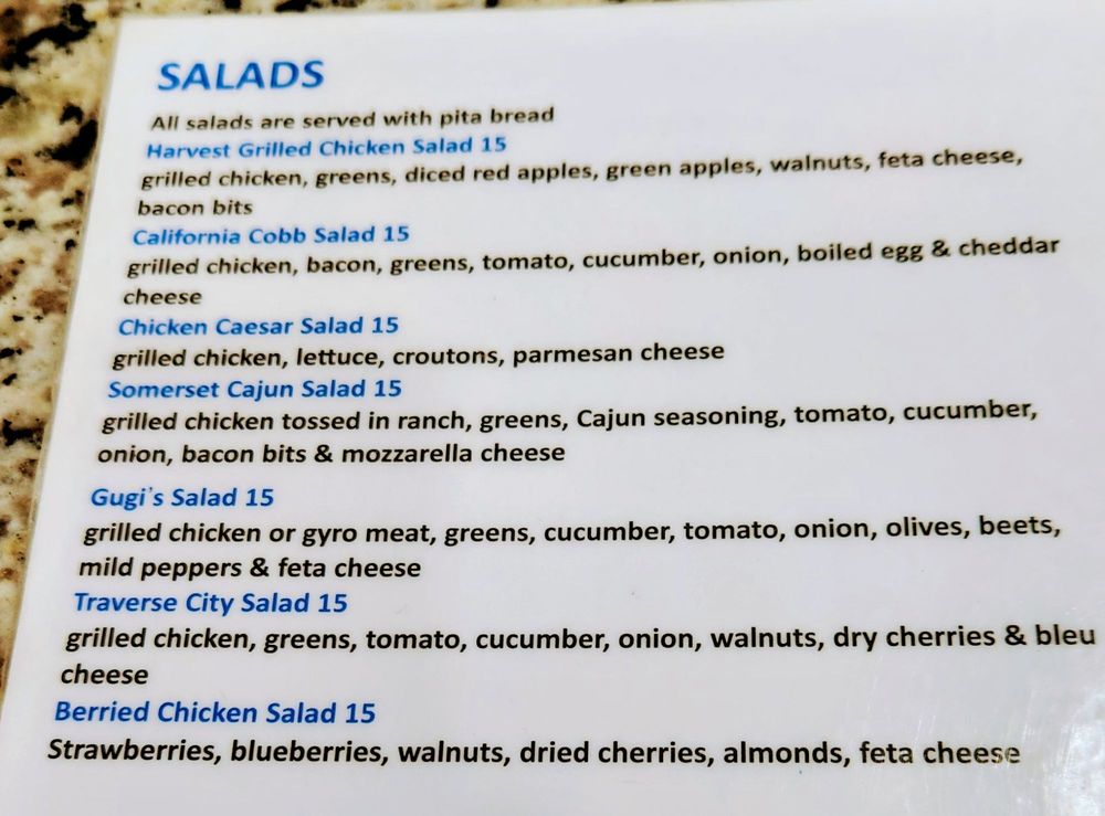 Grilled chicken, greens, tomato, cucumbers, onions, walnuts, dry cherries, and blue cheese
